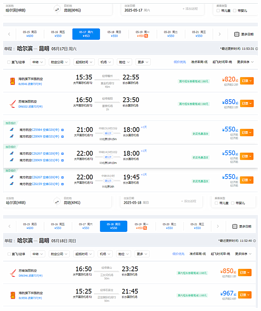 活动集合日 到达昆明的班次均可