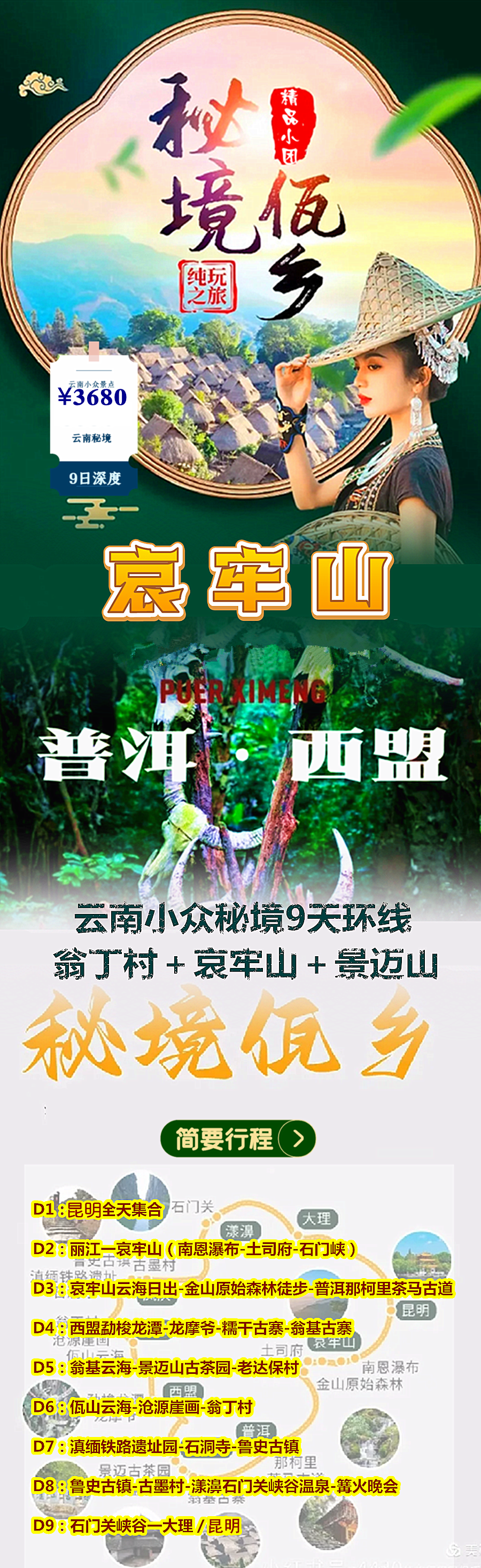 ✪【活动路线】:全国各地—昆明水之队指定酒店全天集合—玉溪哀牢山—哀牢山南恩瀑布—石门峡风光—哀牢山—哀牢山云海日出—哀牢山金山原始森林—那柯里茶马古道—澜沧—西盟勐梭龙潭—龙摩爷—糯干古寨—景迈山翁基古寨—景迈山翁基云海—古茶园—老达保村—沧源—佤山云海—千米国画长廊—沧源崖画—翁丁村—临沧—滇缅铁路遗址园—石洞寺—鲁史古镇—古墨村—石门关峡谷温泉—石门关峡谷—昆明结束
