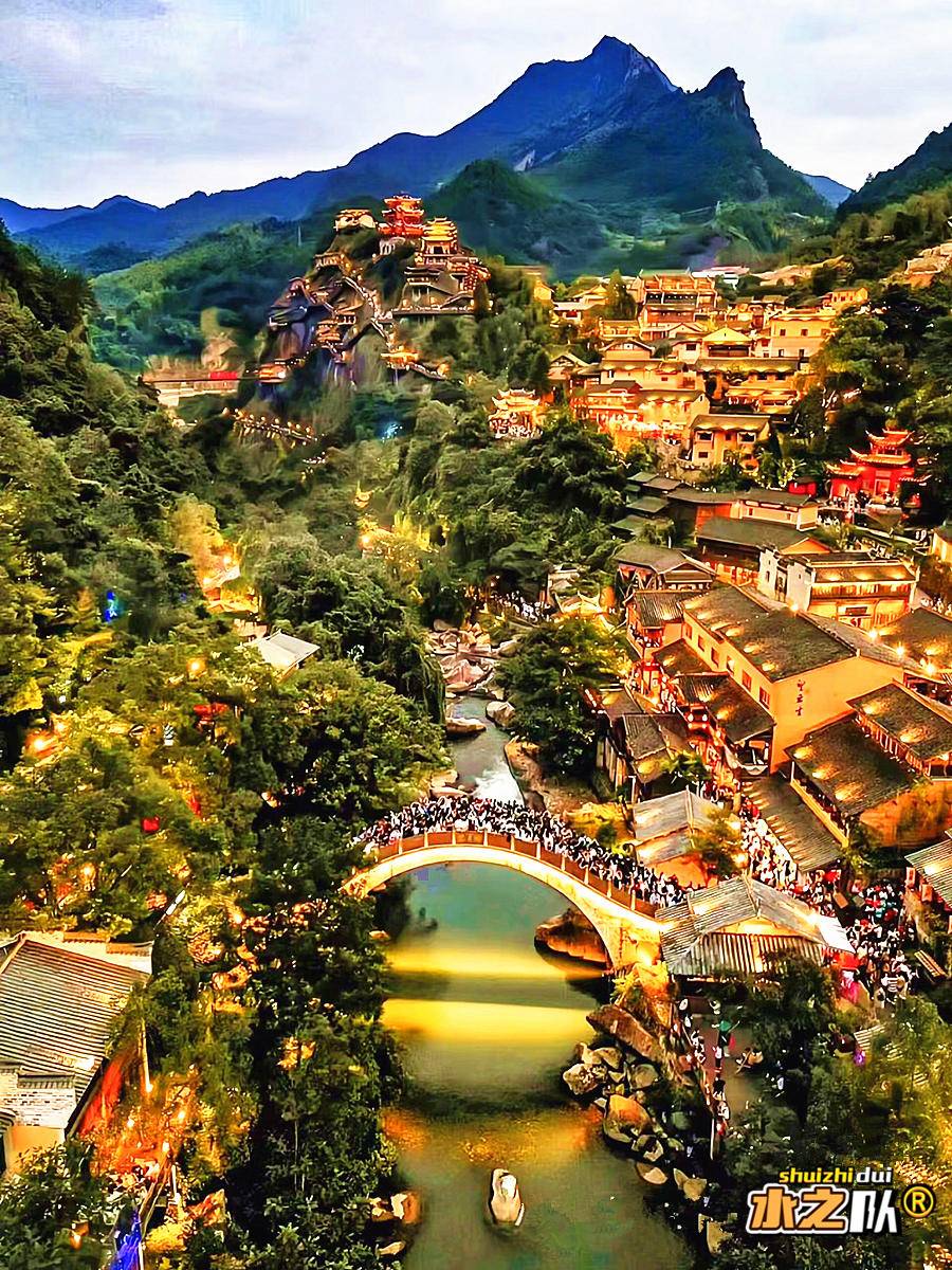 ●望仙谷悬崖夜景——悬空栈道灯火点亮,瀑布与崖壁古建筑交织,圆一场《苍兰诀》同款仙侠梦。