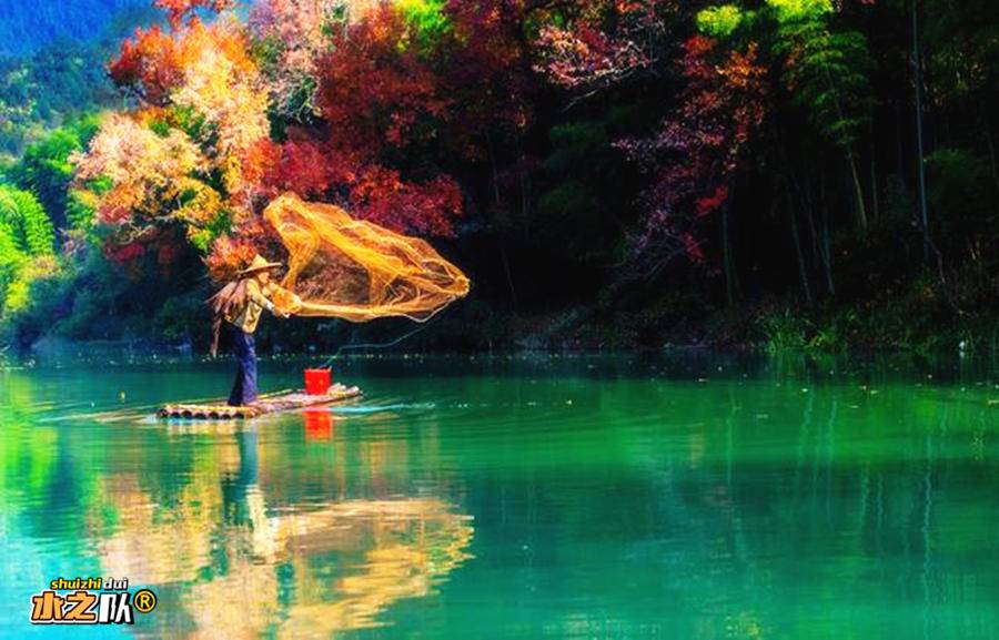 ●婺源月亮湾竹筏漂流——秋日薄雾中泛舟,两岸枫林与徽派建筑倒映水中,仿佛划入油画世界。